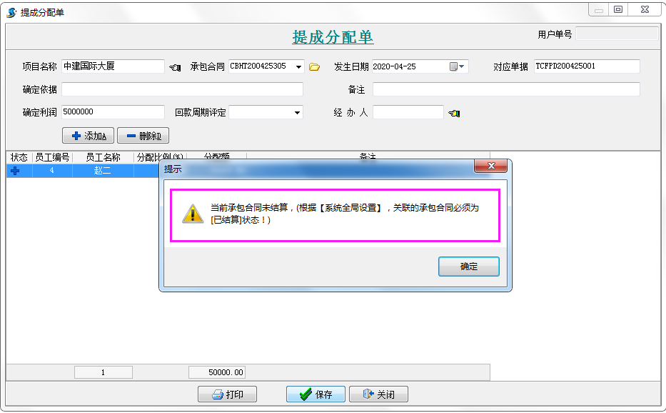很多公司可能会对项目经理及市场部员工投标中标项目有提成奖励,金石软件专门开发提成分配单模块来统计员工提成,并可以生成员工工资,如下图;