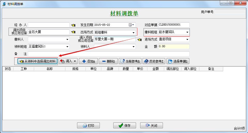 当出场方式为:【班组缴料】时(即施工班组把材料送回来),【添加】左边的按钮显示为【领料选择】,再点击前要先选择好【缴料班组】,如下图:显示当前班组【赵水建筑队】的领料汇总情况。通过【领料选择】可以让用户直接从班组的领料记录中调出材料,既提高效果、又避免出错。