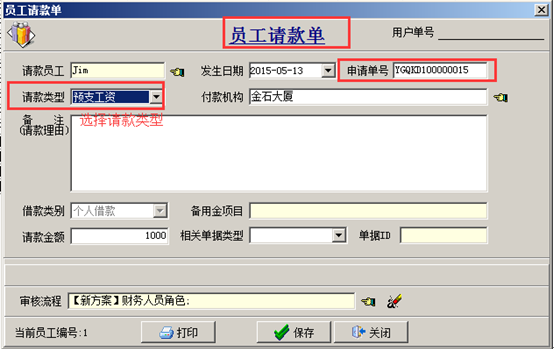 如果员工预支之前需要审核通过,则点击“申请单号”选择对应的“员工请款单”,如图: