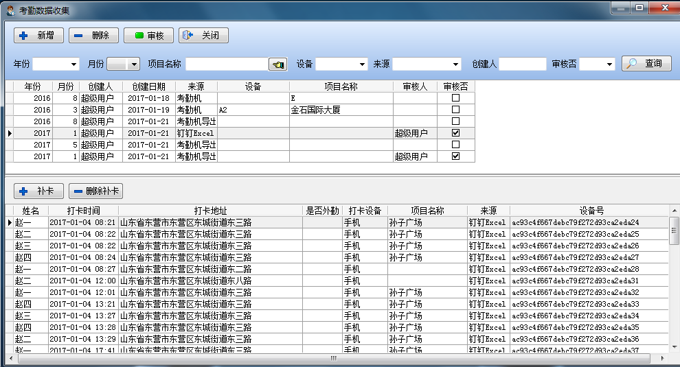 在考勤设备读取操作界面也有相应的查询筛选项,可以通过年份、月份、项目名称、设备、来源、创建人、审核否等相关信息来筛选查询从考勤设备读取的信息。