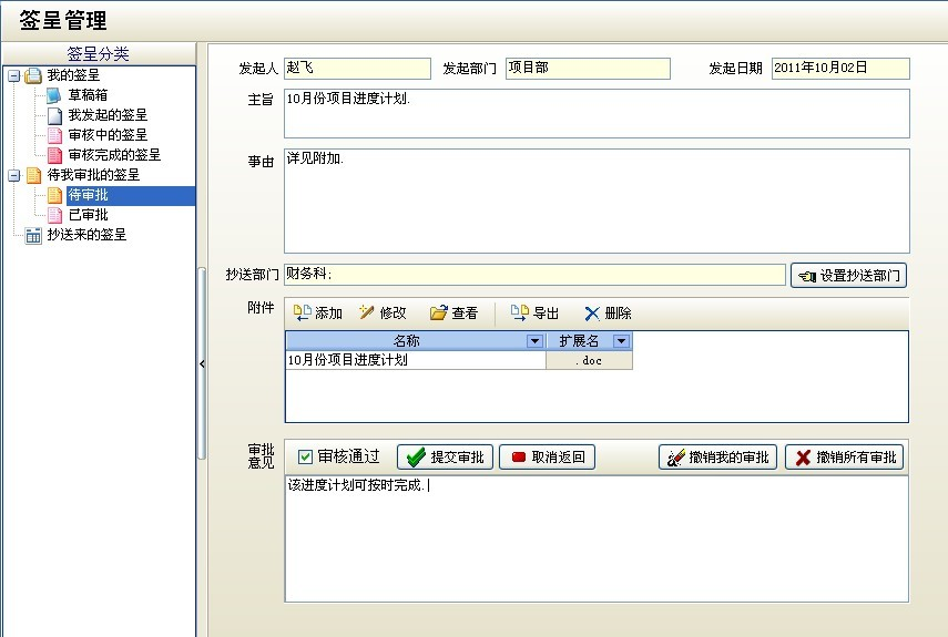 双击打开签呈后在左侧显示签呈内容,右侧显示签呈审批记录。如下图: