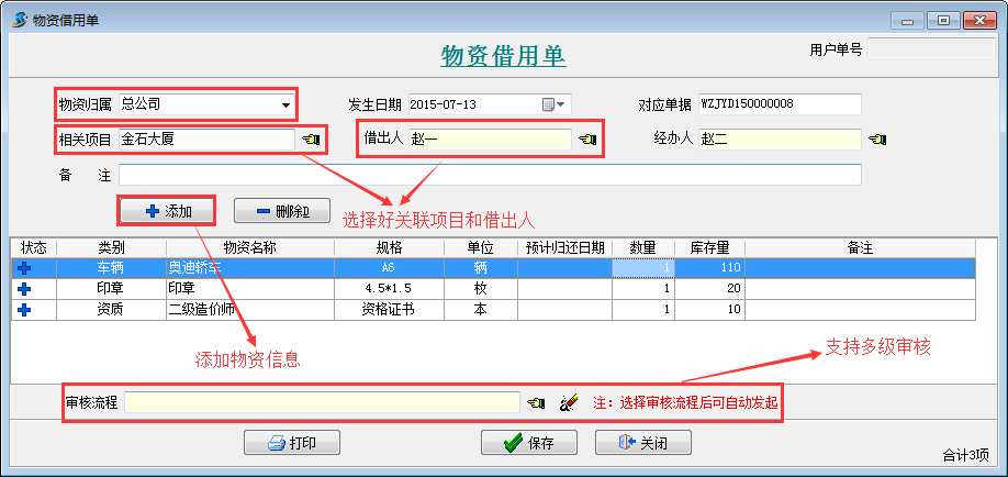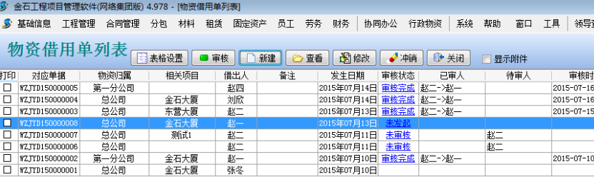 点击主菜单中的【行政物资】->【物资借用单】打开物资借用单列表 点【新建】按钮,录入如下:
